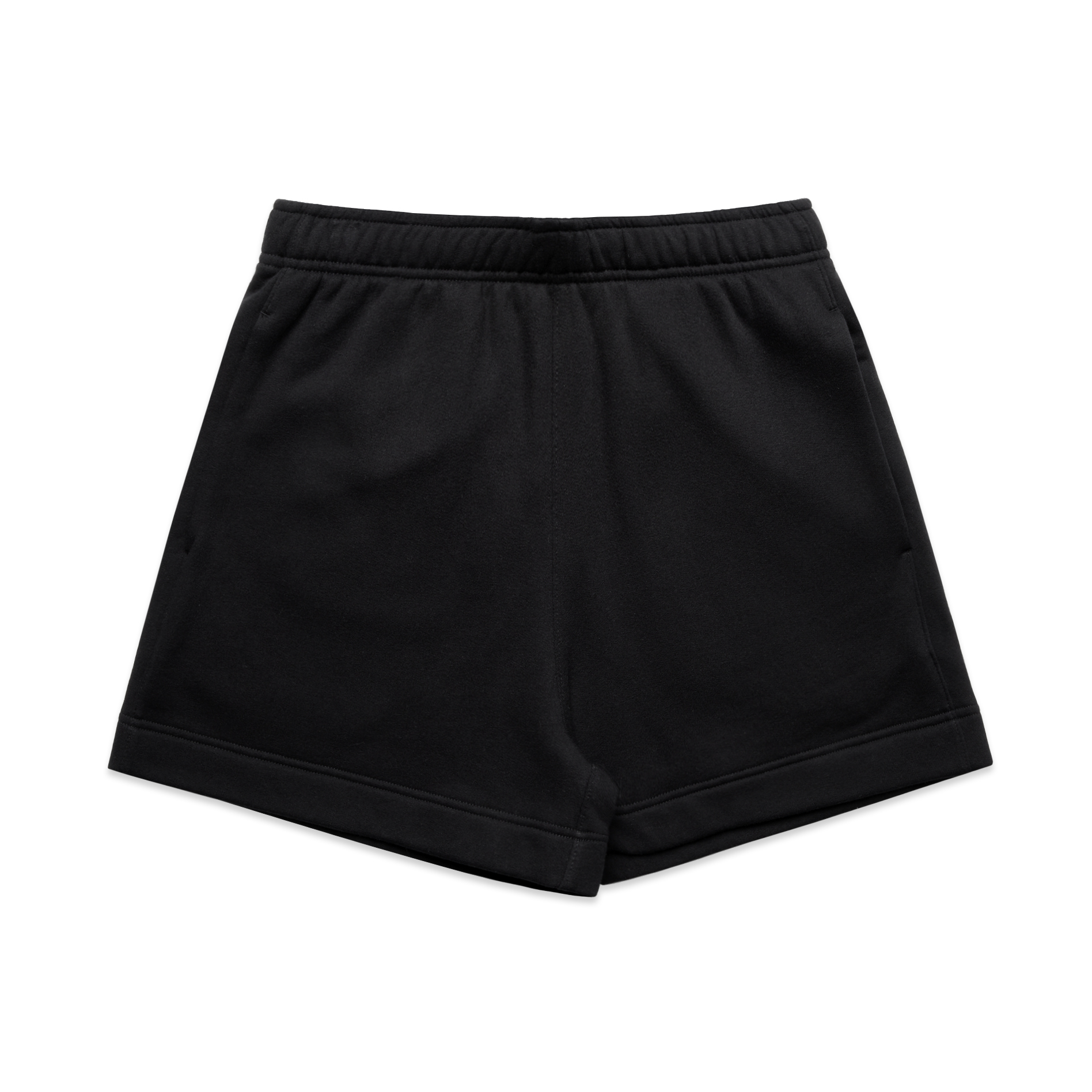 Sweat shorts, self-fabric elasticated waistband, tonal internal drawcord, 2 side pockets, single pocket at back, double needle hems
